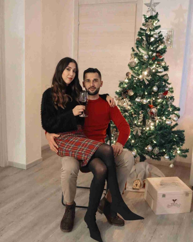 A short checkered skirt for her and a red sweater for him make the perfect festive combo. A playful and cozy Christmas couple outfit full of holiday charm.