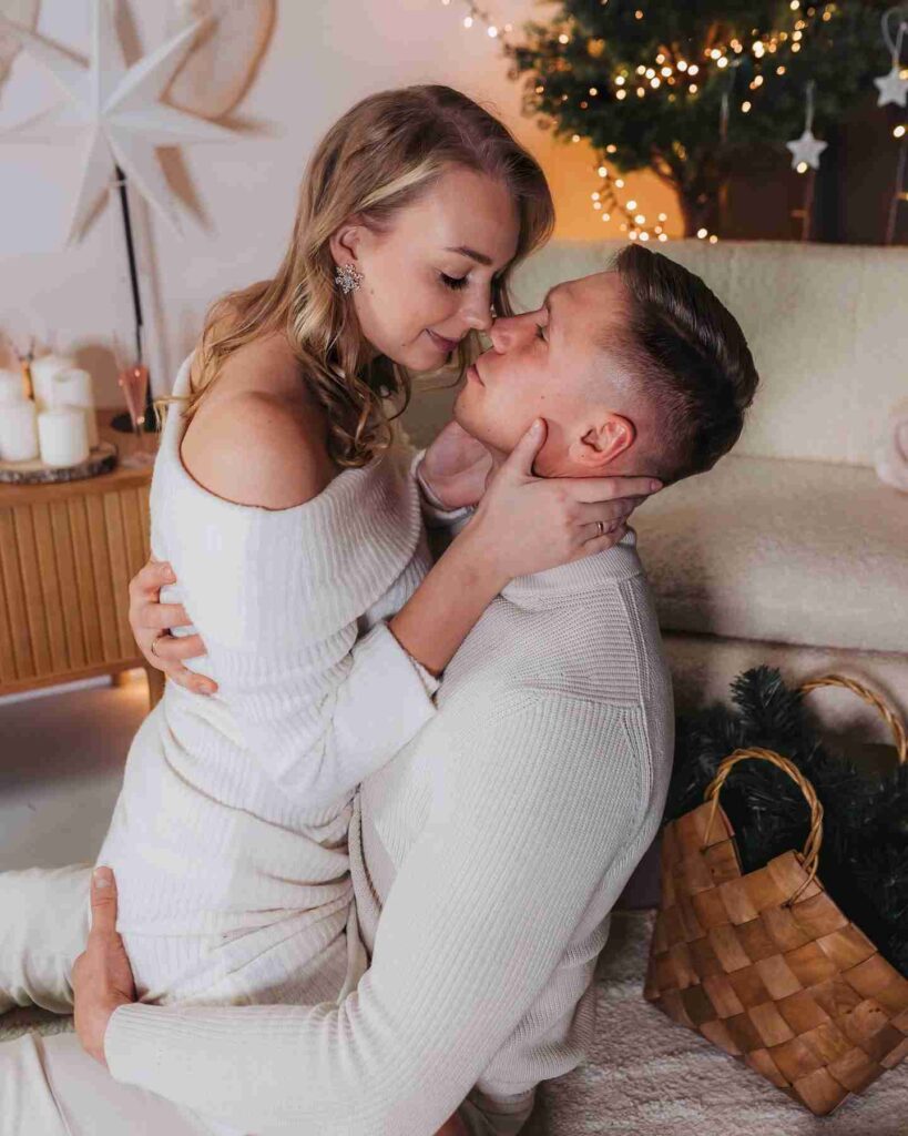 Shine together in matching white outfits for a dreamy Christmas vibe. A chic and elegant couple look that captures the magic of winter.
