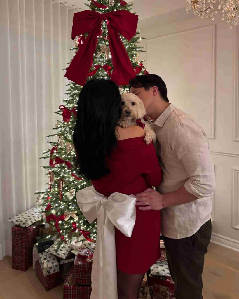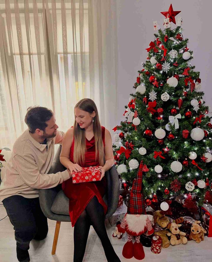 A red dress and a brownish t-shirt create the perfect cozy holiday vibe. A charming Christmas couple look that’s simple yet full of festive warmth.