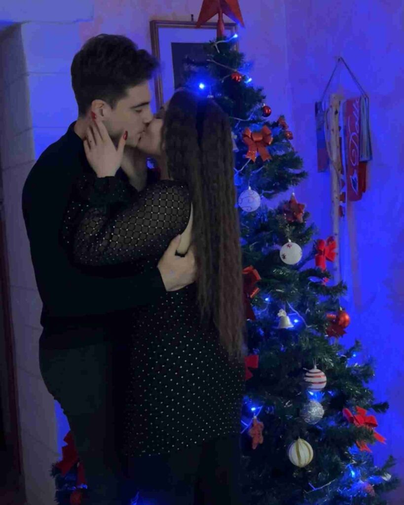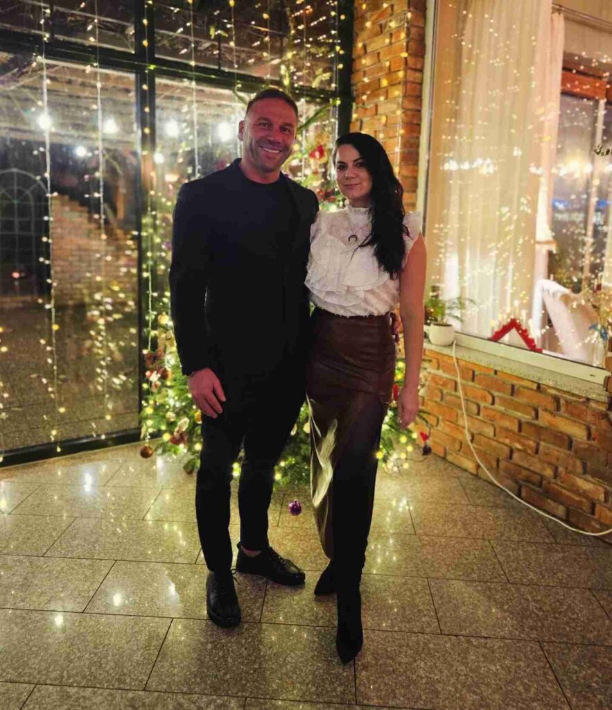 A brown leather skirt paired with his full black outfit creates a stunning festive duo. A classy and modern Christmas couple style that radiates confidence.