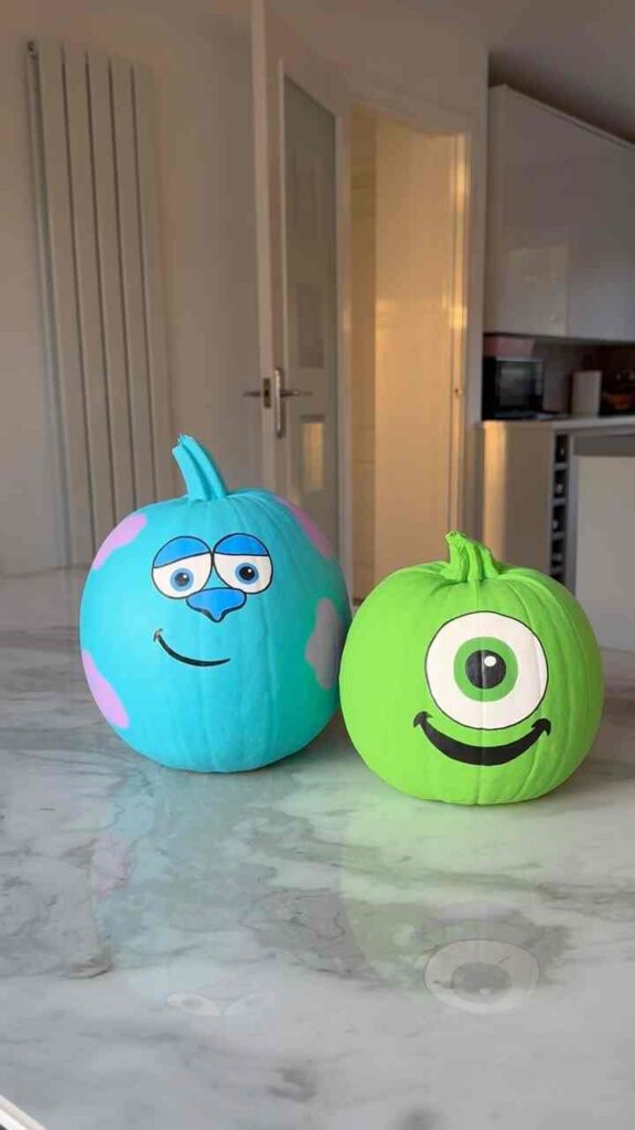 duo, you can turn one pumpkin into Sully with his blue fur and purple spots, and another into Mike with his big green body and giant eye. This project is perfect for families, since kids will instantly recognize their favorite monster buddies.