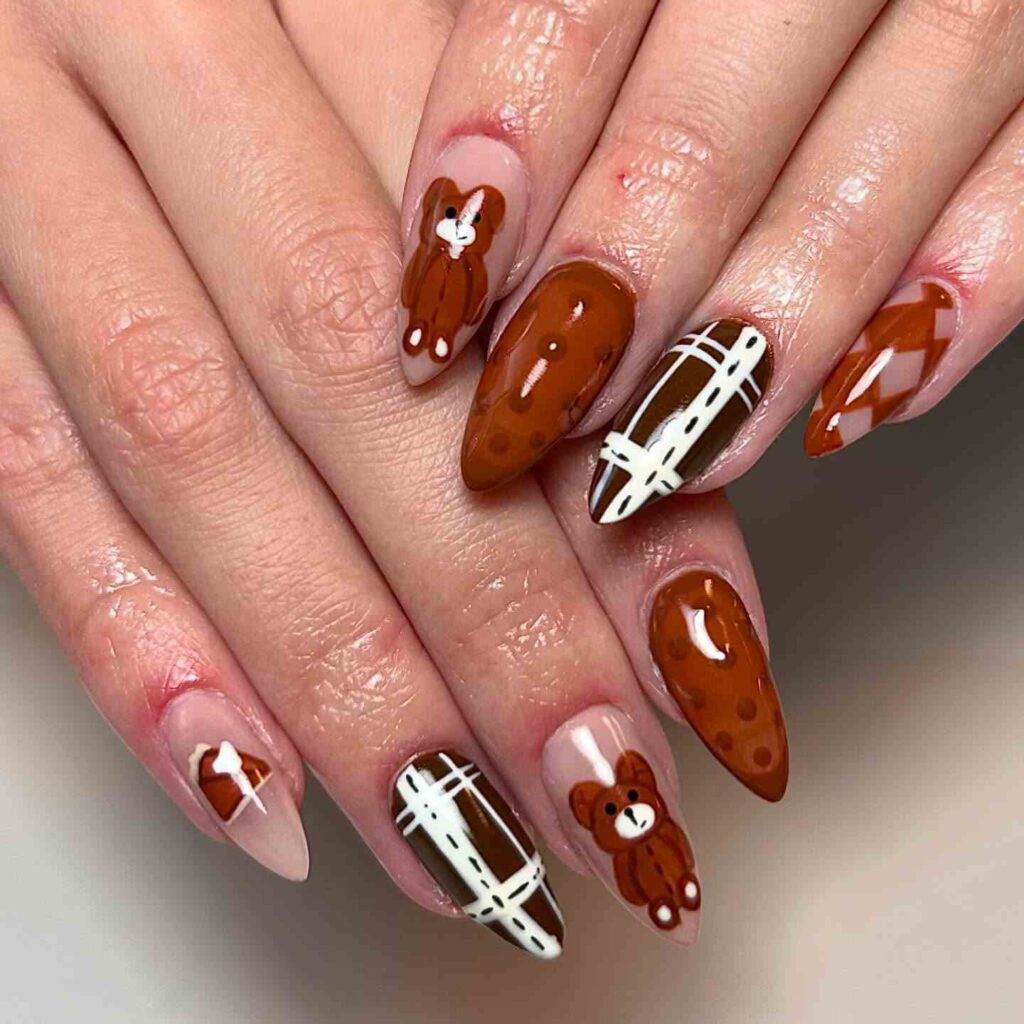A cute and cozy nail design featuring adorable teddy bear accents paired with soft autumn shades. Perfect for Thanksgiving, this look blends playful charm with seasonal warmth — ideal for anyone who loves a sweet, festive touch.