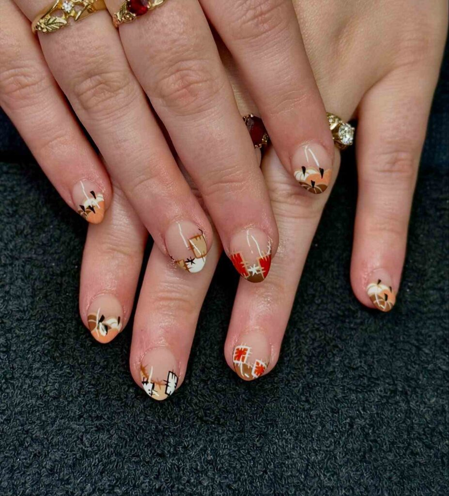 A charming fall-inspired nail design featuring delicate pumpkin accents in warm orange and nude tones. This look perfectly captures the essence of Thanksgiving — cozy, festive, and effortlessly stylish for the autumn season.