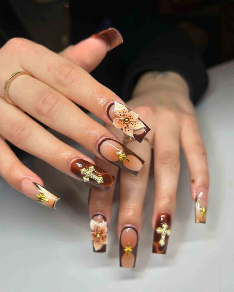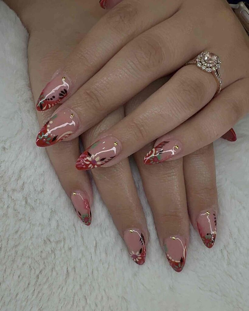 A graceful nail design featuring autumn-inspired floral patterns in warm tones like burnt orange, mustard, and deep red. Perfect for Thanksgiving, this look adds a soft, feminine touch to your holiday style while celebrating the beauty of the fall season.