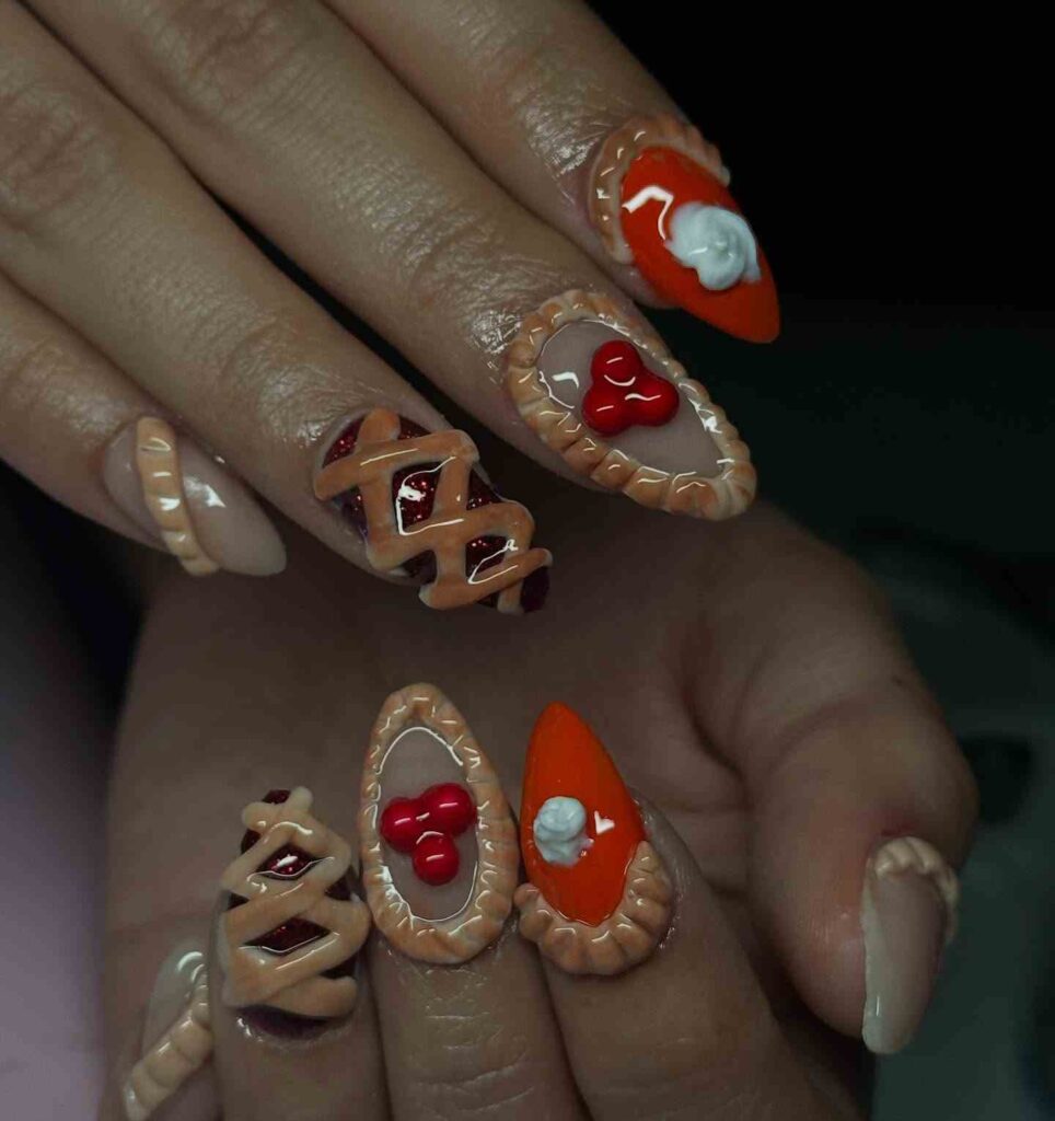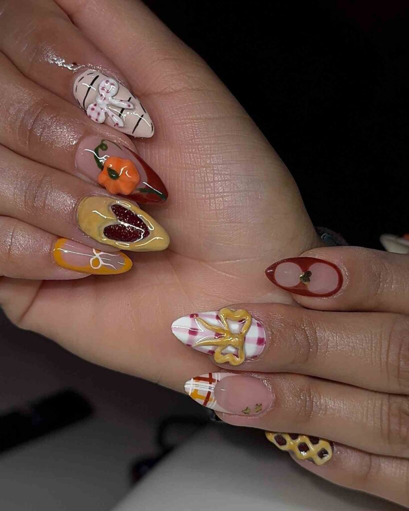 A fun and festive nail design inspired by classic Thanksgiving foods — from tiny turkeys to pumpkins and pies. Full of color and creativity, this look celebrates the holiday spirit with a playful twist, perfect for adding a cheerful touch to your Thanksgiving style.