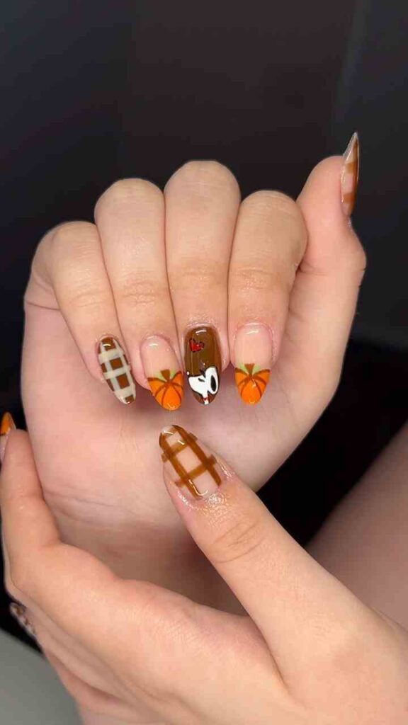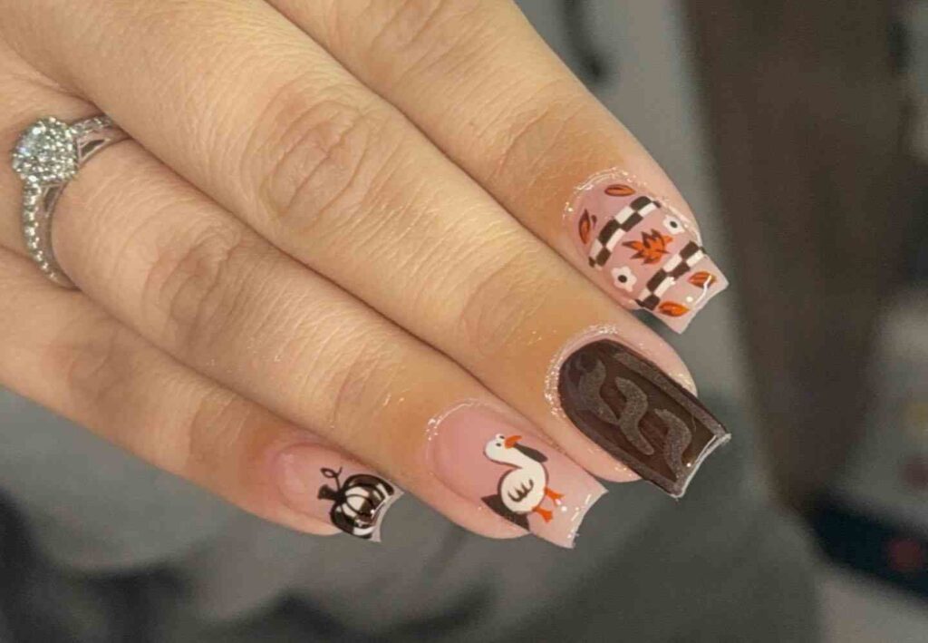 A festive nail design featuring adorable turkey art and warm autumn colors like brown, orange, and gold. Fun, seasonal, and full of personality — these nails perfectly capture the joyful spirit of Thanksgiving celebrations.