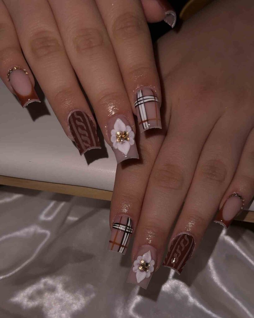 A cozy and stylish nail design inspired by soft fall sweaters, featuring warm brown tones and textured details.